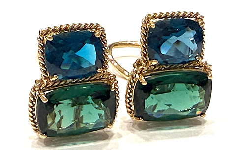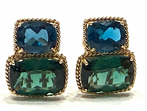 18kt Yellow Gold Cushion Cut Earring with Rope Twist Border with Blue Topaz and Green Quartz